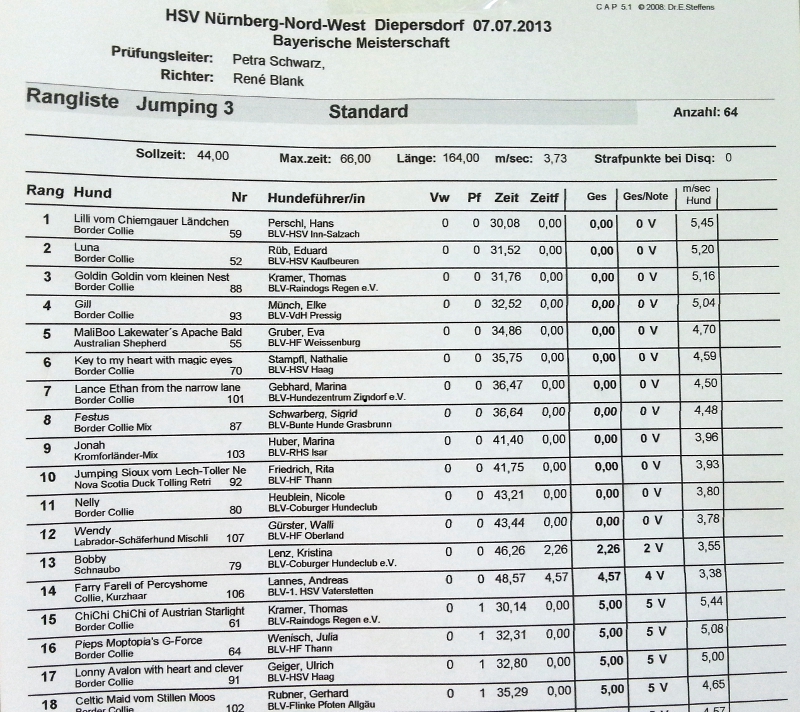Aber nun zum sportlichen Teil :-D. Die Parcours wurden vom BLV-Eigengewächs Udo Niekemper und dem angereisten SGSV-Richter René Blank gestellt, wobei wir besonders mit Udos Hindernisanordnung unsere liebe Mühe hatten. Vor allem im Jumping am Samstag stolperten wir von Sequenz zu Sequenz und zahlten der meisterschaftlichen Hindernishöhe ordentlich Tribut 😳 … worüber am Ende ein Dis den Mantel des Schweigens legte ;-). Besser, aber nicht sehr viel erfolgreicher, navigierte ich den Aussie-Mann am Sonntag durch den A-Lauf! Deutlich besser kamen wir mit Renés Parcours zurecht. Sowohl im A-Lauf am Samstag, als auch im abschließenden Jumping am Sonntag blieben wir (trotz Orientierungsschwierigkeiten in der ersten Sequenz) fehlerfrei, erhüpften einen 5. und 6. Platz und damit 81 Meisterschaftspunkte, die uns einen Platz im oberen Drittel der Gesamtwertung bescherten :-D.