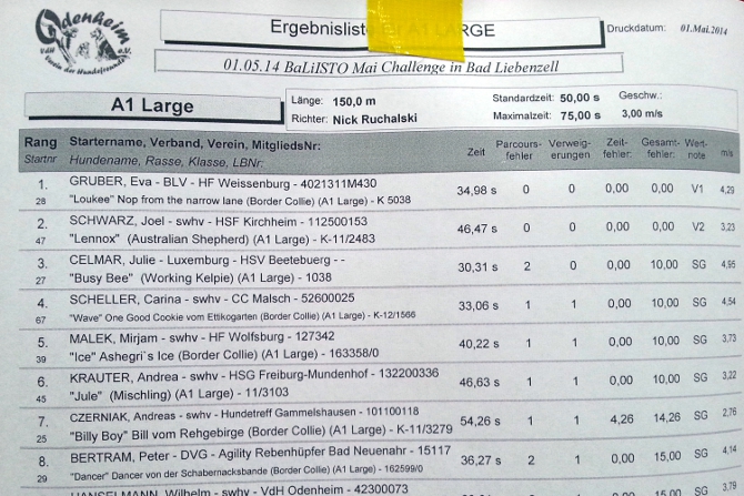 Bei den darauf folgenden Starts wurde ich mit schwindender Nervosität wieder aktiver, griff in das Wettkampfgeschehen ein und konnte fehlerfreie Läufe erfolgreich und ideenreich verhindern 😳 😆 . Auch Lou akklimatisierte sich von Start zu Start und begann in der für ihn absolut neuen und ungewöhnlichen Turnieratmosphäre zunehmend freier zu arbeiten *FREU*. Wir sind im Turniersport angekommen und ich habe die Erkenntnis gewonnen, dass ein A1-Parocours je leichter desto schwieriger ist und umgekehrt 😆 .